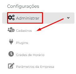 3- Clique na seção “Configurações” clique no menu “Administrar” e clique no botão “Cadastros”.