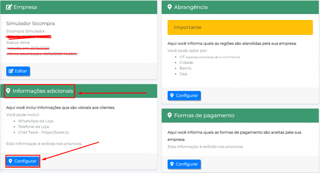 4- Clique no card “Informações adicionais” e clique no botão “Configurar”.