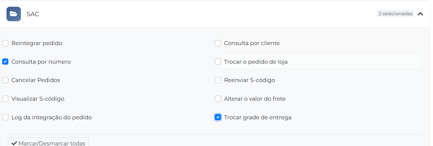 Para realizar esse procedimento é necessário que o usuário tenha acesso em “SAC-> Consulta por numero e Trocar grade de entrega”