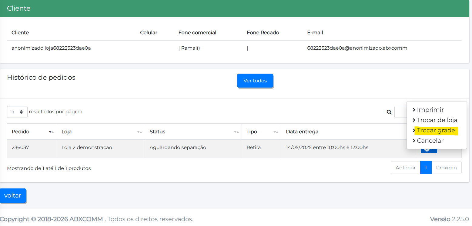 Na tabela de “Histórico de pedidos”, localize a coluna Ações (ícone de engrenagem azul). Clique na seta ao lado do ícone para abrir as opções e selecione “Trocar grade” (destacado em amarelo nas imagens).