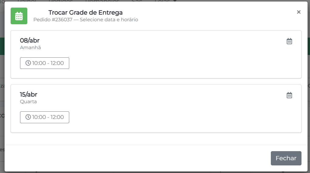 Dica Importante: Sempre confirme com o cliente se o novo horário selecionado realmente o atende antes de finalizar o processo, pois isso impacta diretamente na rota de entrega dos motoristas.