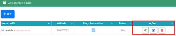 3. Após salvar, o kit estará quase pronto, em ações no quadrado azul você pode fazer algumas alterações como dados do kit e produtos do kit