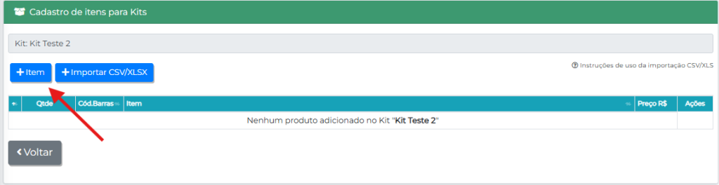 Clicando em produtos do kit, aparecerá uma nova tela. Clique em + item para adicionar produtos manualmente no seu kit.