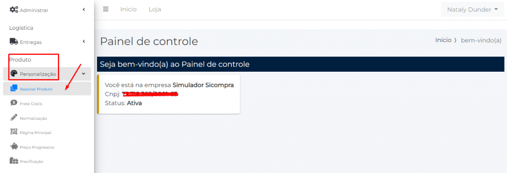 3- Depois que entrou em administrar, clique em “Produto>Personalização>Associar produto”, no canto superior esquerdo da tela.