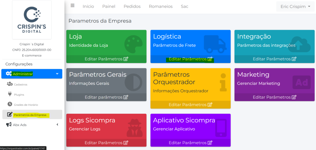 No menu lateral do Orquestrador, acesse Administrar> Parâmetros da empresa> Parâmetros de frete.