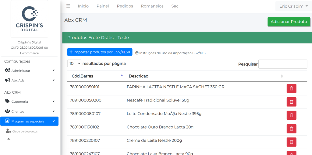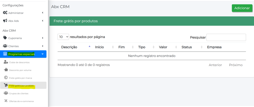No menu lateral do Orquestrador, acesse Abx Crm > Programas especiais e, em seguida, clique na opção Frete Grátis por Produto.