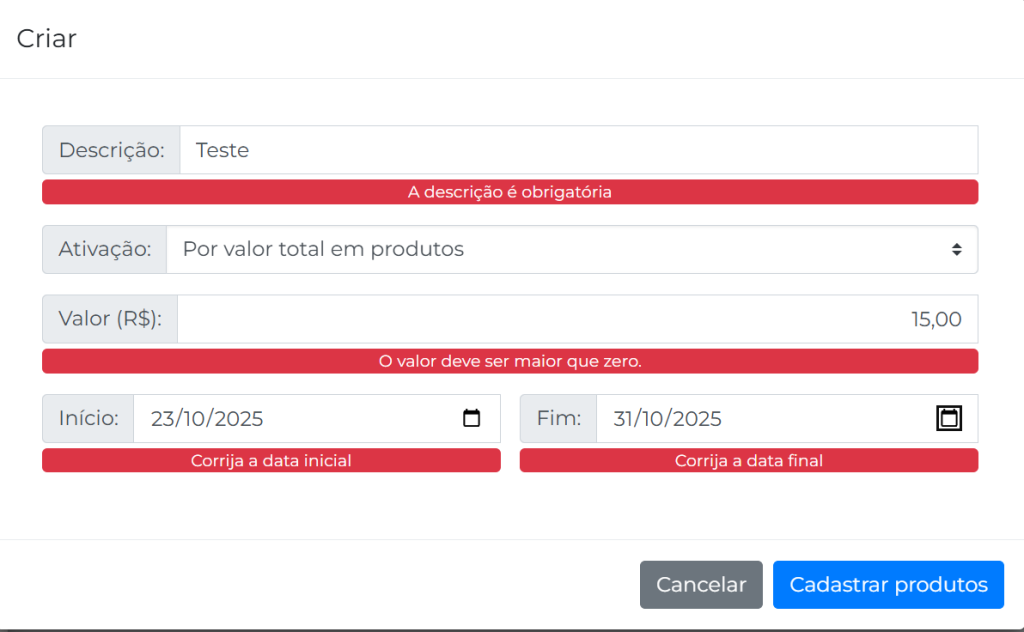 - Valor Mínimo / Quantidade Mínima: Preencha o valor correspondente à opção de ativação escolhida.