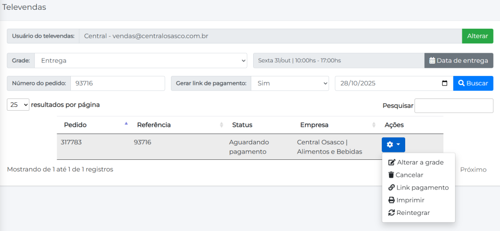 Além disso é possível realizar algumas ações como alterar a grade de entrega, cancelar o pedido, copiar o link de pagamento, imprimir o pedido e reintegrar.