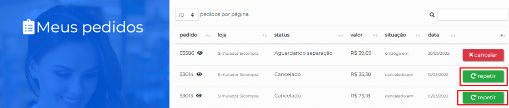 3.1- Clique no botão verde “Repetir” ao lado do pedido que deseja repetir.