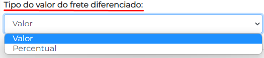 7.2- Selecione no campo “Tipo do valor do frete diferenciado” se será cobrado um valor fixo ou percentual sobre o valor da compra do cliente.