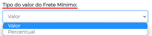 8.2- Informe se será adicionado um valor fixo ou percentual sobre o valor da compra no campo “Tipo do Valor No frete minímo”.