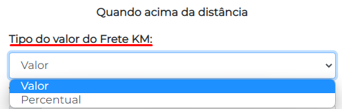 8.4- Informe se será adicionado um valor fixo ou percentual sobre o valor da compra no campo “Tipo do Valor do Frete KM”, quando o valor da compra for inferior ao valor definido no campo “Valor da compra para início do Frete Diferenciado” e superior a distância parametrizada no campo “Distância para Frete Minímo”.
