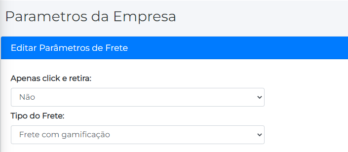 5- Deixe no Ícone “Apenas click e Retira” deixe a opção “Não” e no Tipo de Frete deixe como “Frete com Gamificação”.