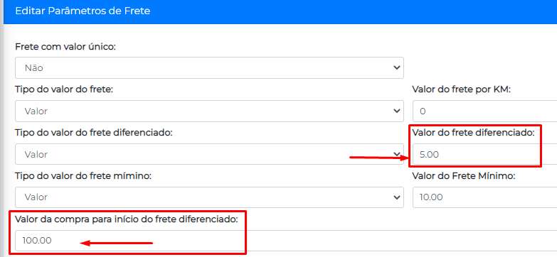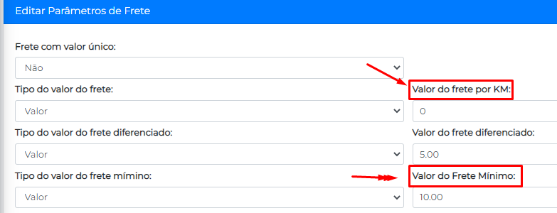 Por exemplo: caso você queira cobrar R$10,00 para qualquer entrega independente da distância digite R$ 0,00 no valor do frete por km e digite R$ 10,00 no Valor do Frete Mínimo . Seu cliente vai pagar R$10,00 pela entrega.