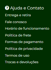 - Ajuda e contato, onde se localiza as Políticas e Termos da loja on-line;
