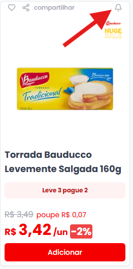 2- No card do produto que deseja ativar a notificação de promoções, se dirija até a parte superior e clique no botão no formato de “Sininho”.