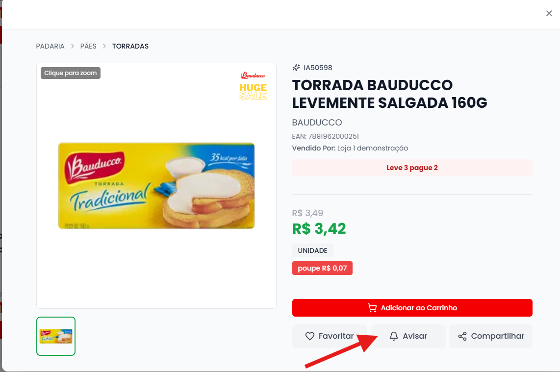 2.1- Também é possivel ativar essas notificações clicando no produto para exibi-lo e clicando em “Avisar”