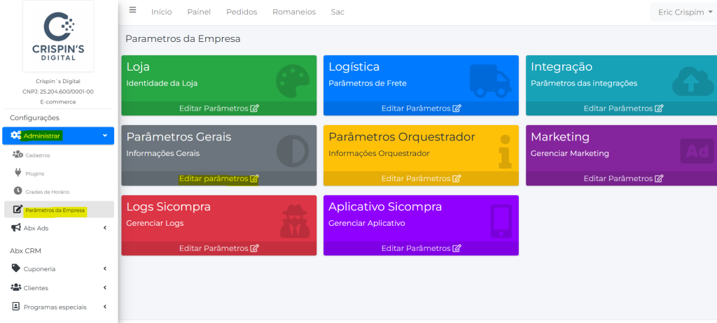 No menu lateral do Orquestrador, acesse Administrador> Parâmetros da empresa>Parâmetros Gerais.