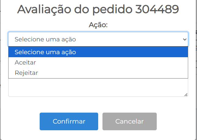 Uma janela se abrirá. No campo Motivo, escreva uma justificativa para a sua ação (seja aprovação ou reprovação). Em seguida, clique no botão Aprovar Pedido ou Reprovar Pedido para finalizar o processo.
