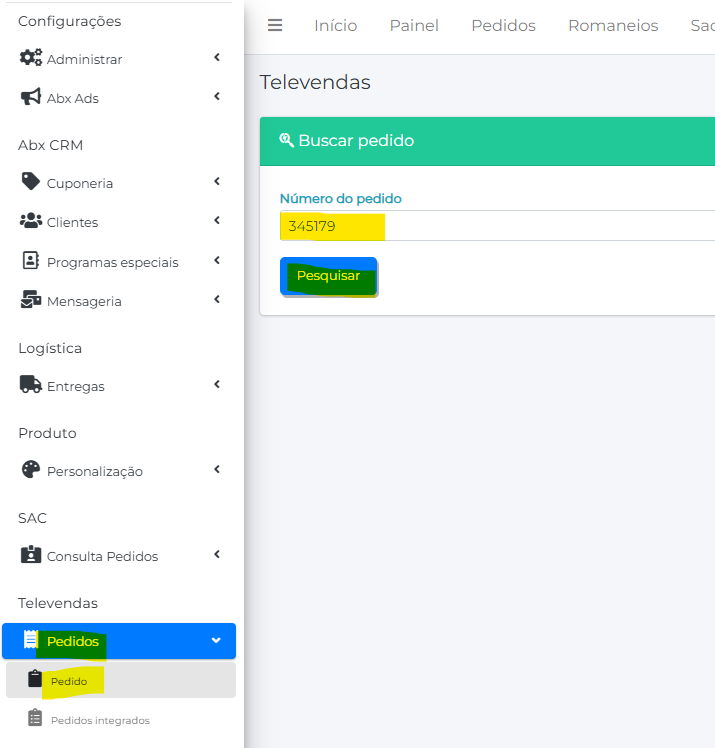 A-) Para realizar esse procedimento é necessário que o usuário tenha acesso à “Logistica> Pedidos Expedição” e ” Televendas> pedidos”